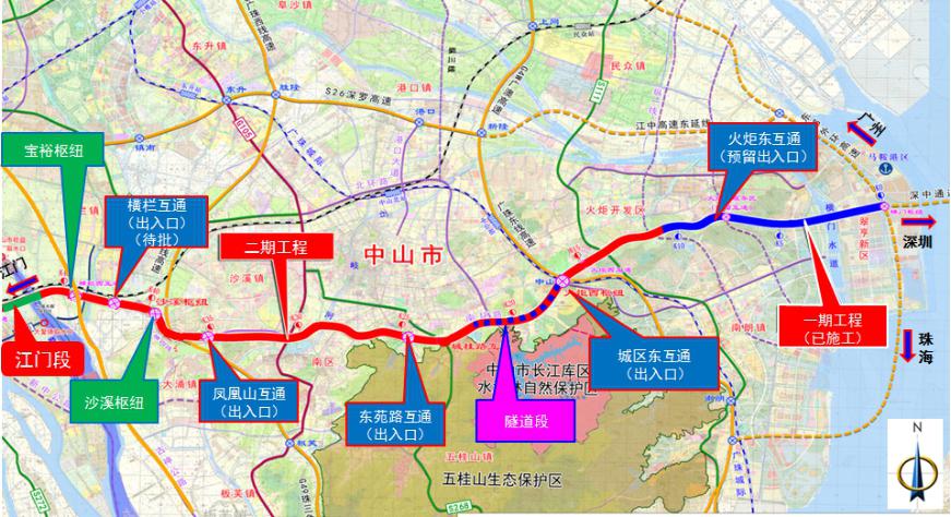 二期工程起于火炬開發(fā)區(qū)大常山隧道,沿博愛路走廊在京珠高速節(jié)點(diǎn)轉(zhuǎn)至南外環(huán)路走廊,沿南外環(huán)路走廊向西跨越岐江河、G105后,轉(zhuǎn)至橫四線走廊(在建),跨越廣珠西線高速,與西部外環(huán)高速交叉后,在磨刀門水道接江門段。