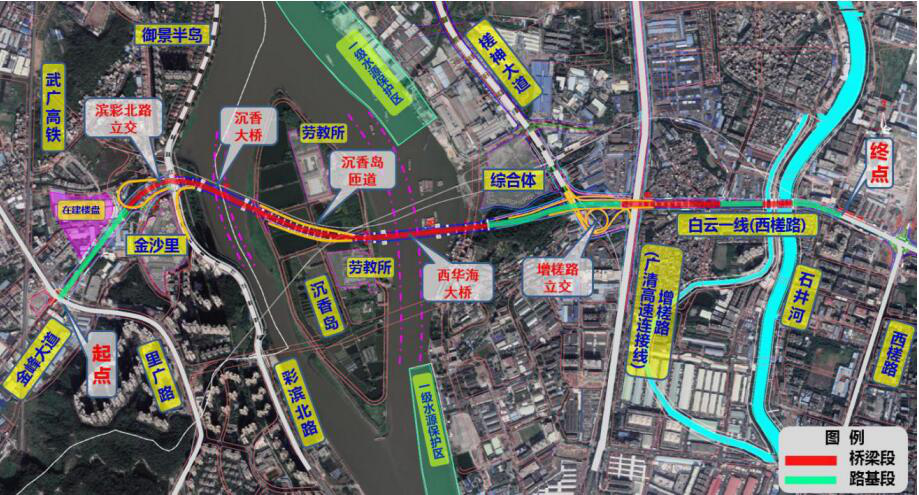 4.建設(shè)規(guī)模:路線全長約 3.89km,紅線寬度 42-61m,采用Ⅱ級公路兼城市主干路標(biāo)準(zhǔn),設(shè)計速度 60km/h,雙向 8 車道。全線設(shè)置 2 座跨越珠江特大橋(沉香大橋、西華海大橋),2 處立交(彩濱北路立交、增槎路立交),2 座匝道(沉香島匝道)。