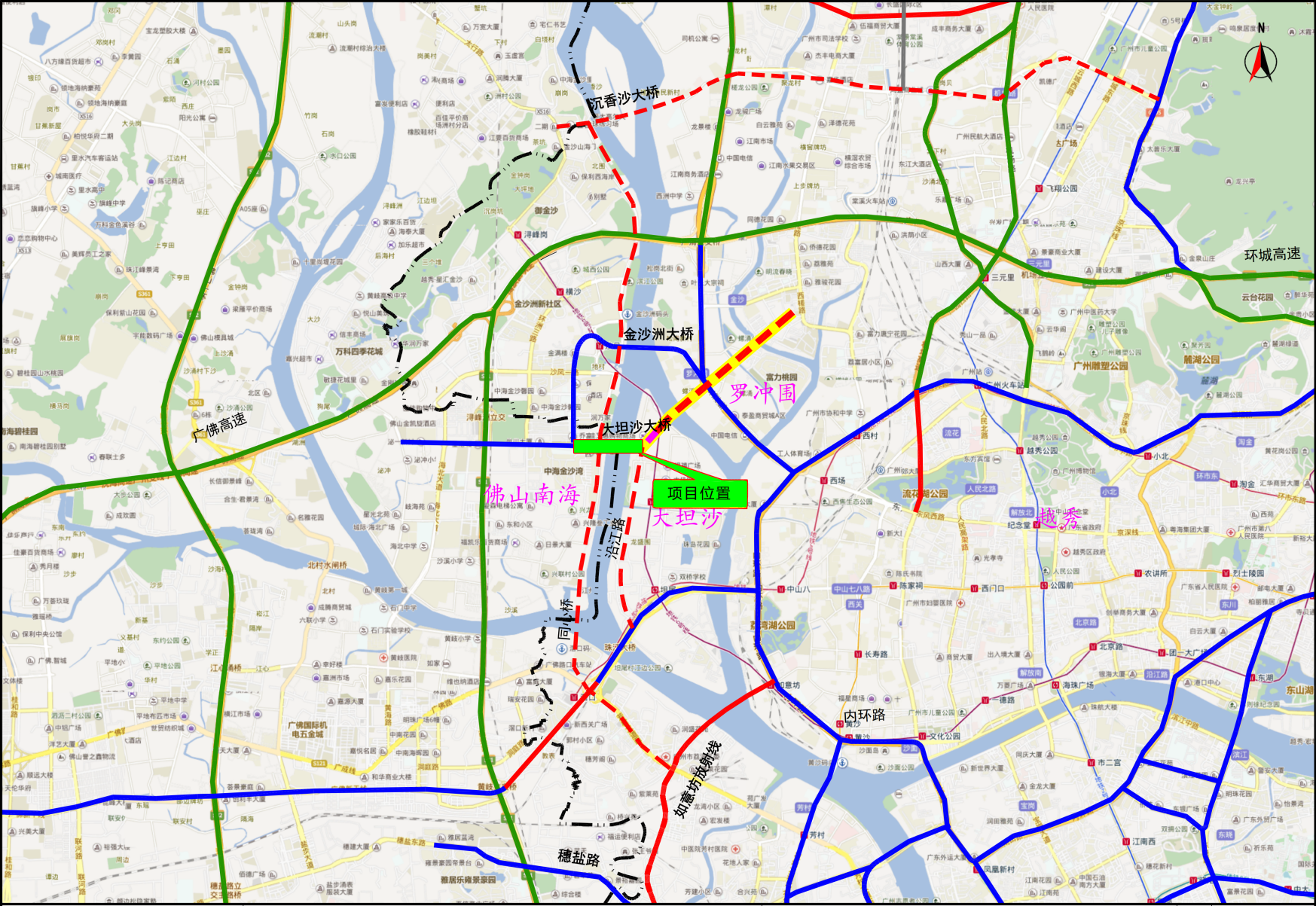 3、項(xiàng)目基本情況:項(xiàng)目西起佛山南海區(qū)建設(shè)大道,上跨白沙河,連接大坦沙島。里程范圍K0+200—K1+070,路線長(zhǎng)約0.87公里。道路等級(jí)為城市主干路,道路規(guī)劃紅線寬40~60米,設(shè)計(jì)行車速度為60km/h。項(xiàng)目含建設(shè)大道立交互通節(jié)點(diǎn)、白沙河大橋主線、大坦沙島立交C、D兩條匝道以及銜接沿江路的部分路段。