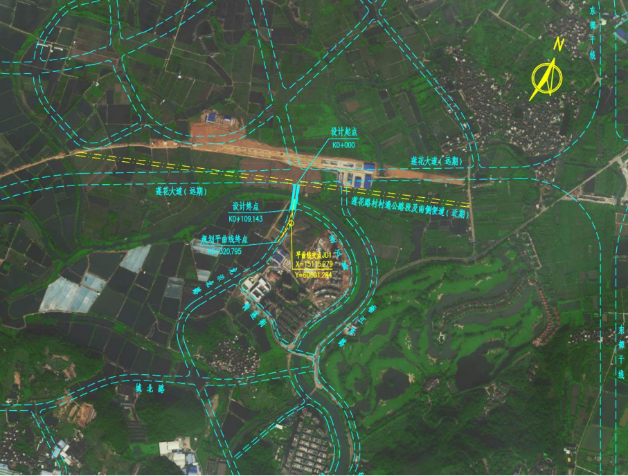 番禺區(qū)龍漖北路(蓮江路至蓮花大道段)工程項目南起蓮江路,北至蓮花大道。道路長度為191m,道路等級為城市次干道,道路紅線寬度為 30m,雙向六車道,設計車速 40km/h。項目建設內容包括:道路工程、橋梁工程、排水工程、交通工程、照明工程等。